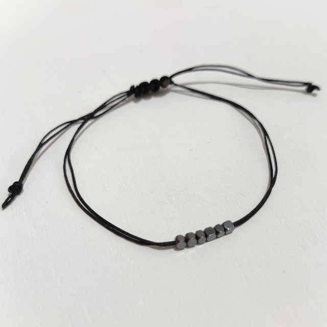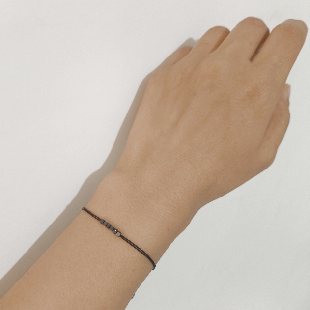 در این مدل، چند مهره کوچک حدید با طراحی مینیمال روی بند مشکی قابل تنظیم قرار گرفتن. همین سادگی باعث شده دستبند هم سبک باشه هم برای استفاده روزمره کاملاً راحت. بند کشویی هم باعث میشه برای اندازههای مختلف مچ مناسب باشه.