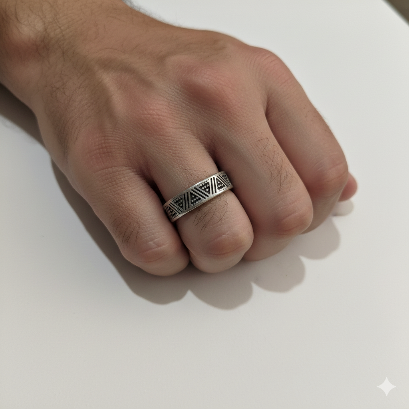 ترکیب مثلثهای منظم و نقطهچینهای ظریف روی بدنه این کار، تضاد تیره و روشن جذابی ایجاد کرده که باعث میشه انگشتر روی دستت حسابی خودنمایی کنه.