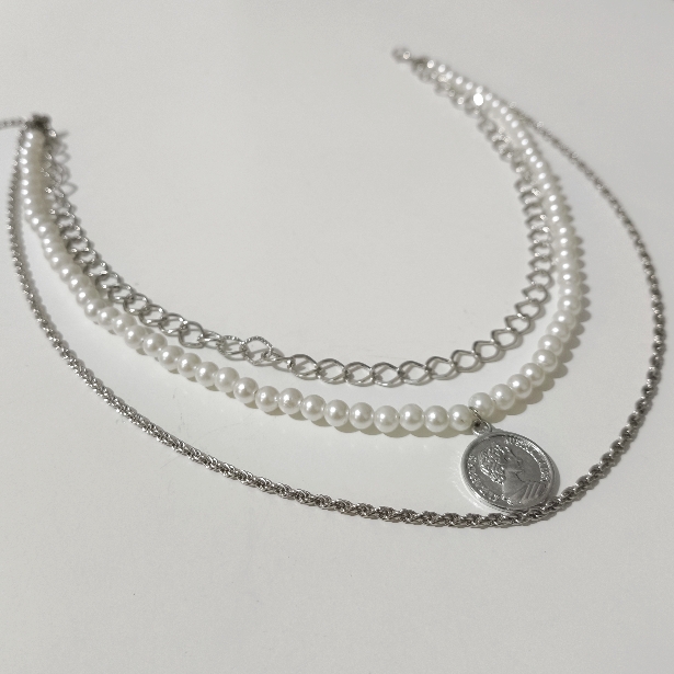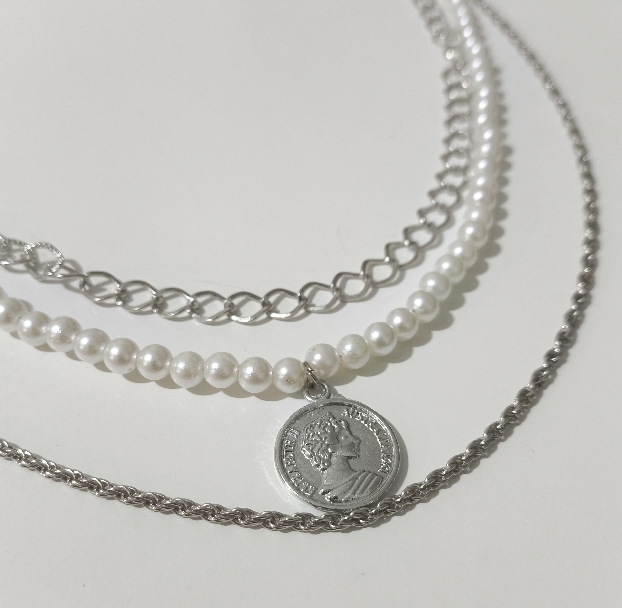 اگه دنبال یه ترکیب کلاسیک و مدرن هستی، این گردنبند با ردیف مرواریدی و پلاک سکه الیزابت همون انتخابیه که استایلت رو از سادگی درمیاره. تضاد بین ظرافت مرواریدها و درخشش زنجیرهای نقرهای، یه نمای فوقالعاده شیک و لایهبندی شده روی گردنت ایجاد میکنه که برای هر مجلسی چشمگیره.